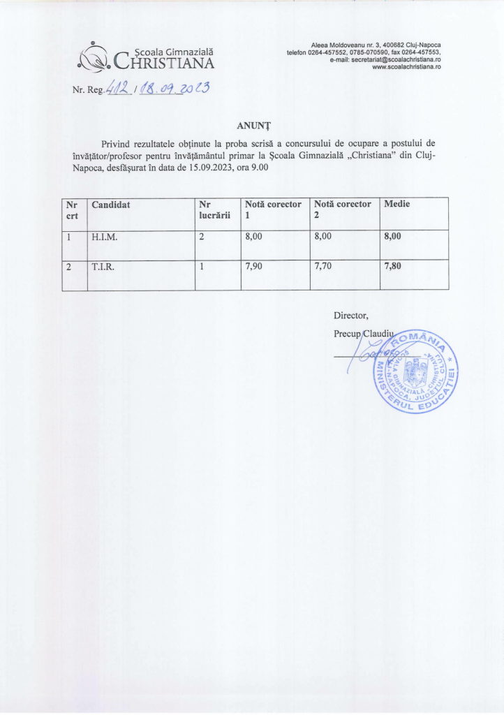 Rezultate obținute la proba scrisă a concursului organizat în data de 15 Septembrie 2023